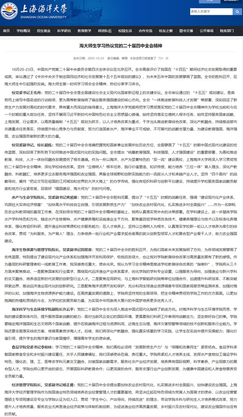 深入开展研究,切实抓好贯彻落实。作为上海市、教育部深化综合改革的“双试点”高校,学校党委在抓好全会精神学习的同时,围绕重点任务开展研究讨论,推动学习成果与学校重点工作深度衔接。2025年11月25日至26日,学校组织召开了中国共产党上海海洋大学第二届委员会第三次全体会议,审议通过了《上海海洋大学深化综合改革方案(草案)》,方案聚焦服务国家战略和上海、行业产业发展需求,将高质量持续推进学校“双一流”建设,确保“十四五”规划顺利收官,同时扎实做好“十五五”规划编制工作,确保学校事业发展始终沿着正确方向行稳致远。