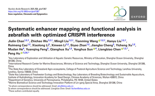 12月19日,上海海洋大学水产与生命学院/水产生物育种中心胡鹏教授、陈良标教授团队在国际知名期刊《核酸研究》(Nucleic Acids Research)在线发表了题为“Systematic Enhancer Mapping and Functional Analysis in Zebrafish with Optimized CRISPR Interference” 的研究论文(https://academic.oup.com/nar/article/53/22/gkaf1367/8383833),系统报道了关于鱼类非编码调控的重要研究进展。Nucleic Acids Research在Scopus遗传学领域排名5/348,近五年年均影响因子16.8,是全球最具影响力的分子生物学期刊之一。