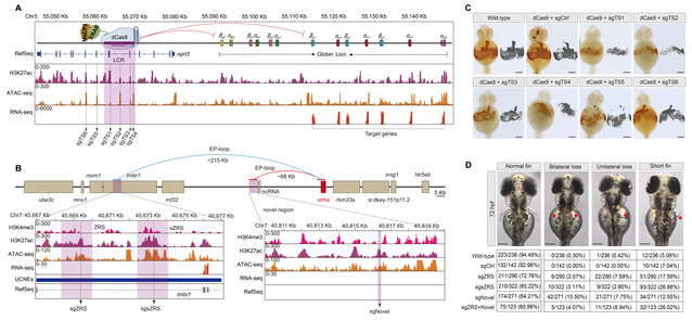 在这项工作中,团队以斑马鱼胚胎为研究对象,整合Hi-C、ATAC-seq等多组学数据,成功绘制出400多对增强子与基因之间互作关系的“基因遥控网络图”,覆盖鱼类早期发育的关键时段。在此基础上,研究人员利用CRISPRi技术按下多个增强子的“开关”,观察到了直观的生物学响应:例如,当调控血液发育的增强子被抑制后,血红蛋白水平明显下降;当控制鳍条生长的增强子被关闭时,超过40%的胚胎出现鳍条缺失表型。