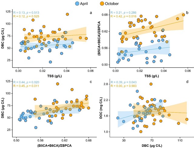 理论上,径流量增加会对水体中的DBC浓度产生稀释作用。雨季后DBC浓度升高表明,存在额外的DBC来源汇入河流系统。这种现象在中下游河段表现得尤为明显。此外,研究发现无论是雨季前(R = 0.44,p < 0.05)还是雨季后(R = 0.45,p < 0.05),DBC与(B5CA + B6CA)/ΣBPCA比值均呈显著正相关。这一结果说明,长江流域DBC浓度升高与高凝结度DBC的额外输入存在直接关联。
