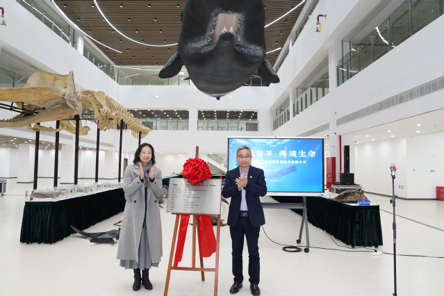 校党委副书记、校长胡炜(右)与校党委副书记、副校长夏雅敏(左)为抹香鲸标本档案揭幕