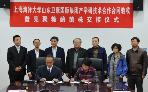 2013年11月26日,由我校与山东卫康国际集团的产学研技术合作项目“壳聚糖酶的工业化发酵生产研究”验收暨壳寡糖酶生产菌株交接仪式在校图文信息中心101室举行。我校潘迎捷校长、谢晶处长出席了项目验收暨菌株交接仪式。山东省临沂市国家级高新技术产业开发区管委会朱烨副主任、山东省临沂市国家级高新技术产业开发区科技局李瑞学副局长、山东卫康国际集团王宗继董事长参加了会议。会议由食品学院党委书记陈江华主持。