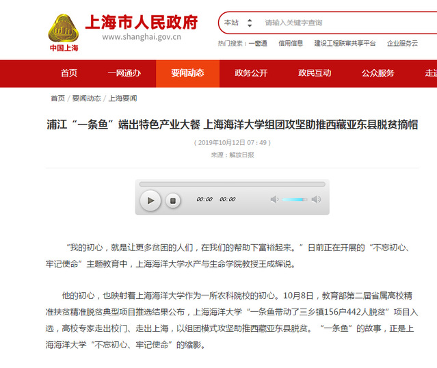 他的初心,也映射着上海海洋大学作为一所农科院校的初心。10月8日,教育部第二届省属高校精准扶贫精准脱贫典型项目推选结果公布,上海海洋大学“一条鱼带动了三乡镇156户442人脱贫”项目入选,高校专家走出校门、走出上海,以组团模式攻坚助推西藏亚东县脱贫。“一条鱼”的故事,正是上海海洋大学“不忘初心、牢记使命”的缩影。