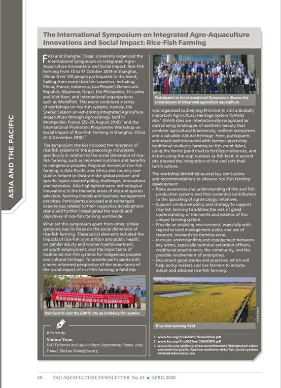 联合国粮农组织渔业及水产养殖部2020年4月发布的水产养殖时事通讯FAN第61期专题介绍了2019年10月13日至17日由上海海洋大学、联合国粮食与农业组织(Food and Agriculture Organization of the United Nations,FAO)共同主办的“稻渔综合种养技术创新与社会效益国际研讨会”。
