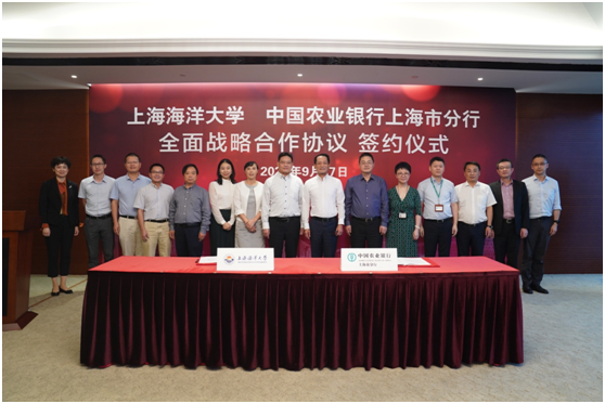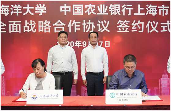 9月17日下午,上海海洋大学与中国农业银行上海市分行全面战略合作签约仪式在农行上海市分行举行。校长程裕东,中国农业银行上海市分行党委书记、行长陈其昌出席签约仪式并致辞,上海海洋大学总会计师郭爱萍、中国农业银行上海市分行副行长张青分别代表双方在全面战略合作协议上签字。中国农业银行上海市分行相关机构负责人及学校职能部门、学院负责人参加签约仪式。