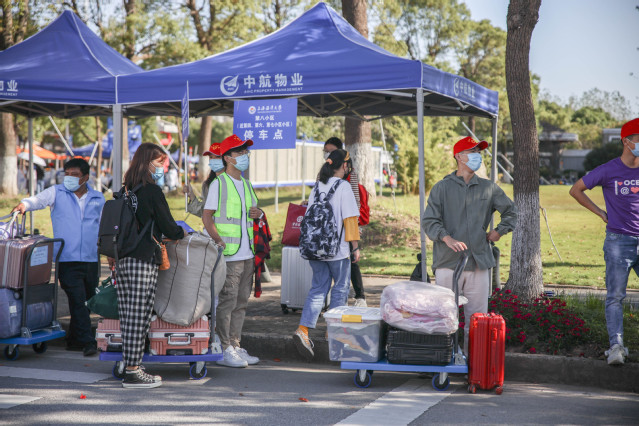 为保障新生健康安全,实现新生从家到学校无缝衔接,后勤与基建管理处安排机场、车站、地铁站迎新大巴,校内安排校园摆渡车,贴心行李小推车;保卫处组织退伍学生校门口维持新生进校秩序;校团委招募2500余名志愿者为新生开展一对一志愿服务,掌握新生出行方式、出行时间,迎接新生入校、辅助搬运行李,引导宿舍入住、指导新生办理报到手续,全程为新生服务;更有60余名教职工党员全程参与迎新工作,确保职责分工到人,保证万无一失安全迎接新生。