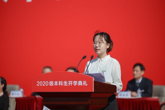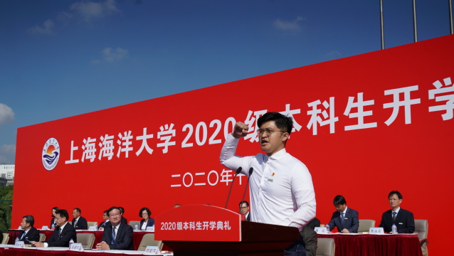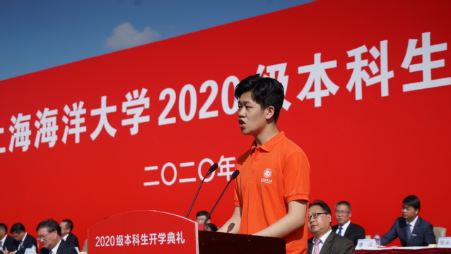 2020级海洋科学学院江海天同学代表新生发言,他说,本届新生“生于非典,考于新冠”,然而他们不失青春朝气和拼搏斗志,选择海大意味着人生新的起点、新的征程,号召广大新生传承百年海大精神,勇于攻坚克难,不负青春韶华。