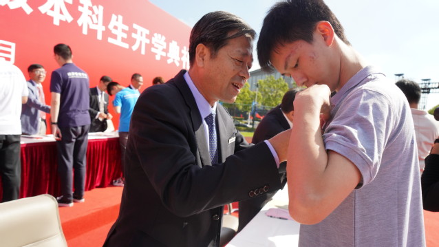 主席台领导为新生佩戴校徽