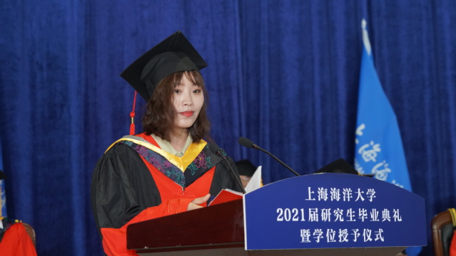 毕业生代表、食品学院研究生张敏回忆了海大美好时光,祝福母校再创辉煌,并表示绝不辜负母校的培养,不辜负老师的期望,努力工作,争做国民表率、社会栋梁。