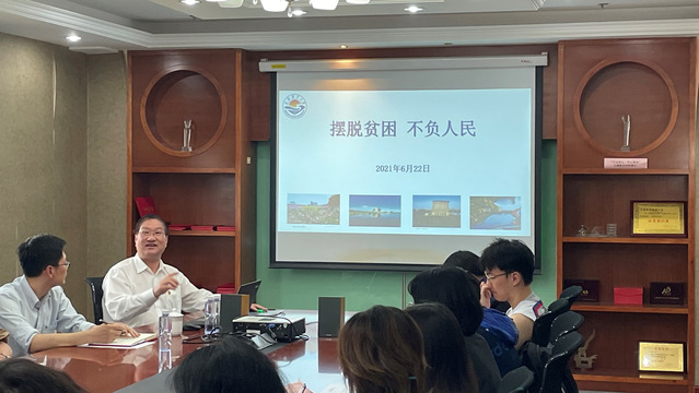 党委副书记吴建农以《摆脱贫困,不负人民》为题,为外国语学院学生讲授了党课。吴建农从“扶贫协作”“对口支持”“特殊对口支援”“对口合作”等方面介绍了学校在党的带领下为决战脱贫攻坚、乡村振兴做出的突出贡献,勉励同学们要发扬“咬定青山不放松,加油踏实干”和“成功不必在我,成功必定有我”的精神,担起青春的使命,“以史为道”,汲取榜样的力量,做真正“有魂”“有为”“有胆”“有识”的四有青年。