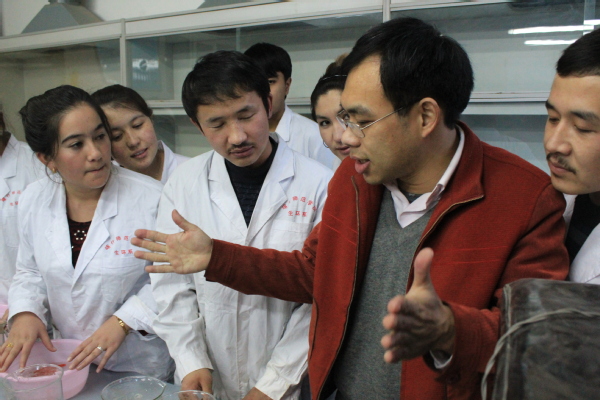 焦俊鹏在支教时带领民族学生在喀什地区开展历时4个多月的水域环境野外调查。他们徒步或骑行,有时候坐上越野车,到喀什东湖、吐曼河、克孜河和恰克玛克河调查水环境质量和生产力水平。在野外实践教学中,焦俊鹏传播生态文明思想和环境保护理念,系统地传授水域环境监测和全过程质量控制技术。他还指导两名当地青年助教,把水域生态环境调查与保护的实践教学传统和教书育人经验如星星之火在喀什师范学院和南疆地区传承下去。如今,他们教过的学生已经在南疆三地州一线成为业务骨干,挑起生态环境保护大梁。支教期间,凌云主动承担了《普通生物学》《环境毒理学》两门课程的教学任务。喀什师范学院实验室资源和教学经费有限,在校方支持下,他争取到全程电化教学,将收集多年的多媒体教学素材展示给学生,让学生耳目一新。课堂上学生们对知识的渴望感动了凌云,他在课余时间自费采购实验材料,主动加开了鱼类解剖实验和鱼类毒性实验课程,向学生讲解鱼类学、鱼类生理学、鱼病学知识,传授鱼类学和毒理学实验技术。实验课上,凌云与新疆少数民族学生互动,让他们能更深入地了解上海海洋大学学生的学习过程和学习方法。
