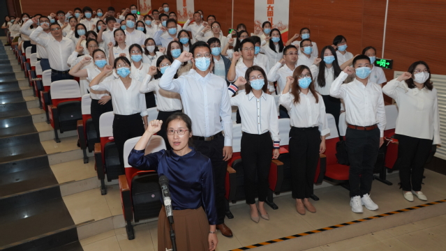 由上海市育才奖获得者水产与生命学院华雪铭教授领誓,新教工举起右手,庄严宣誓入职。