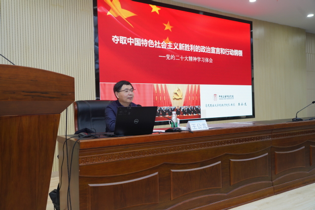 上海市委党校马克思主义学院执行院长王公龙教授以“夺取中国特色社会主义新胜利的政治宣言和行动纲领”为主题作专题报告,从党的二十大召开的深刻历史背景与重大意义,二十大报告的主题、框架和特征,二十大报告的主要内容和理论创新,在学懂弄通做实党的二十大精神上下功夫等四个方面进行了详细阐释。
