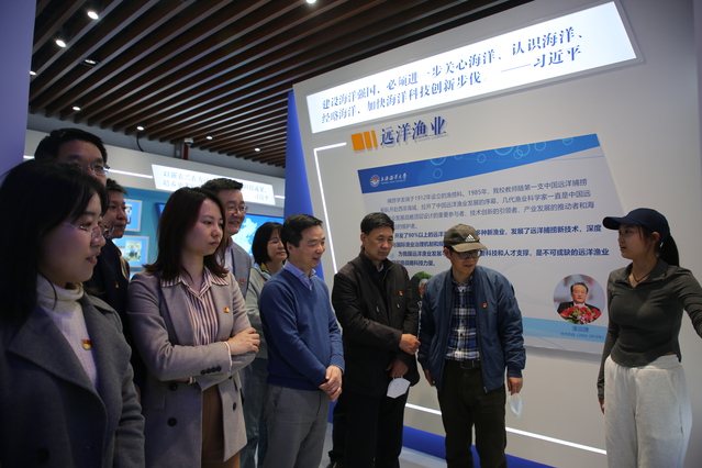 紧接着,党员同志们来到了海洋科技大楼,参观了一流学科展厅及远洋渔业科技馆。在一流学科展厅,党员同志们走到学科布局、远洋渔业、水产品高质化利用等板块纷纷驻足细看,共同感受水产和海洋学科的魅力。在远洋渔业科技馆,党员们在陈新军如数家珍的讲解中,了解了从“养鱼”到“捕鱼”再到“吃鱼”的不易,感受到了国家远洋渔业30多年的巨大变化,对建设远洋渔业强国有了更多的认识和思考。