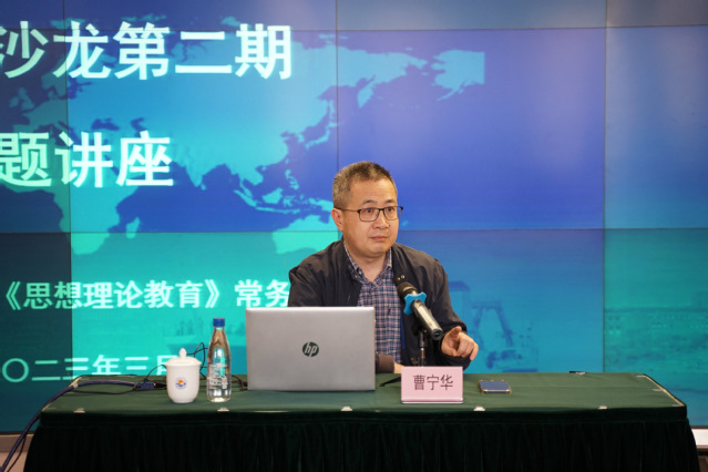 曹宁华首先介绍了辅导员队伍与工作概况,指出了队伍建设中现存的问题,强调辅导员队伍需要继续加强业务研究,提升工作业务能力水平。随后,曹宁华对思想政治教育研究选题进行介绍,围绕学习贯彻落实党的二十大精神、以教育目标为导向的高校思政工作创新研究、系统化架构的高校思政工作体系研究、以党建为统领的高校思政工作创新研究等作交流。曹宁华通过生动幽默的语言和自身工作经历,深入浅出地为现场教师讲解了新时代青年学生的思想行为特点、思政工作重难点、思政研究创新与突破点等。