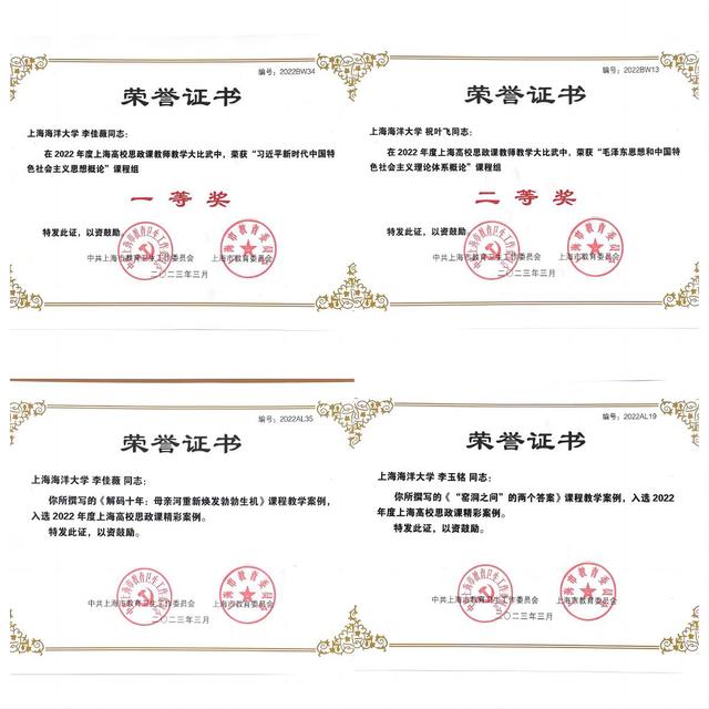 上海海洋大学马克思主义学院董玉来教授第四次入选上海市高校思想政治理论课名师工作室(2022-2024)主持人,青年教师李佳薇获2022年度上海高校思想政治理论课教师教学大比武《习近平新时代中国特色社会主义思想概论》课程一等奖,青年教师祝叶飞获《毛泽东思想和中国特色社会主义理论体系概论》课程二等奖,李玉铭、李佳薇分别撰写的案例《“窑洞之问”的两个答案》《解码十年:母亲河重新焕发勃勃生机》入选2022年度上海高校思想政治理论课精彩案例。