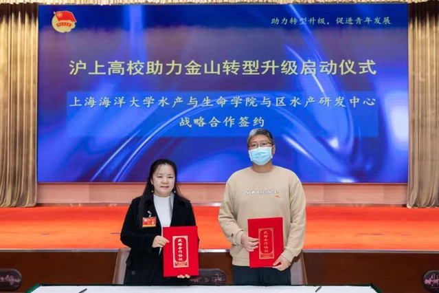 水产与生命学院刘红副教授作为代表同区水产研发中心签订战略合作协议。在交流环节,刘红表示自1989年起学院便与漕泾对虾养殖公司成功合作开展中国明对虾的工厂化育苗和河口水健康生态养殖。30多年间形成了罗氏沼虾苗种繁殖与种虾培育技术、河口区育苗用水净化调配和废水循环利用技术、虾类温室集约化健康养殖等技术。近二十余名海洋大学教师在金山开展各类研发工作,近两千名学生在金山完成实习或毕业论文,双方共同承担了省市级以上科研项目25项,生产虾苗超百亿,发表论文近百篇,获市级奖励2项,科研开发小组获上海市劳动模范集体称号。