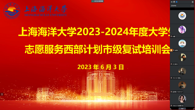 根据团中央《关于印发2023-2024年度大学生志愿服务西部计划实施方案的通知》。6月3日,“2023-2024年度大学生志愿服务西部计划市级复试培训会”在线上举行。校团委、往届西部计划志愿者代表、2023届西部计划市级复试同学参加此次培训。