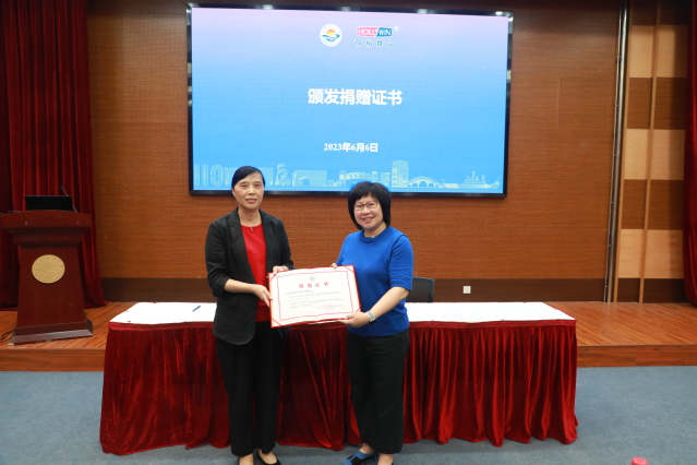 捐赠仪式上,上海荷裕冷冻食品有限公司向学校捐赠100万元。校总会计师、基金会副理事长郭爱萍接受捐赠并颁发捐赠证书。
