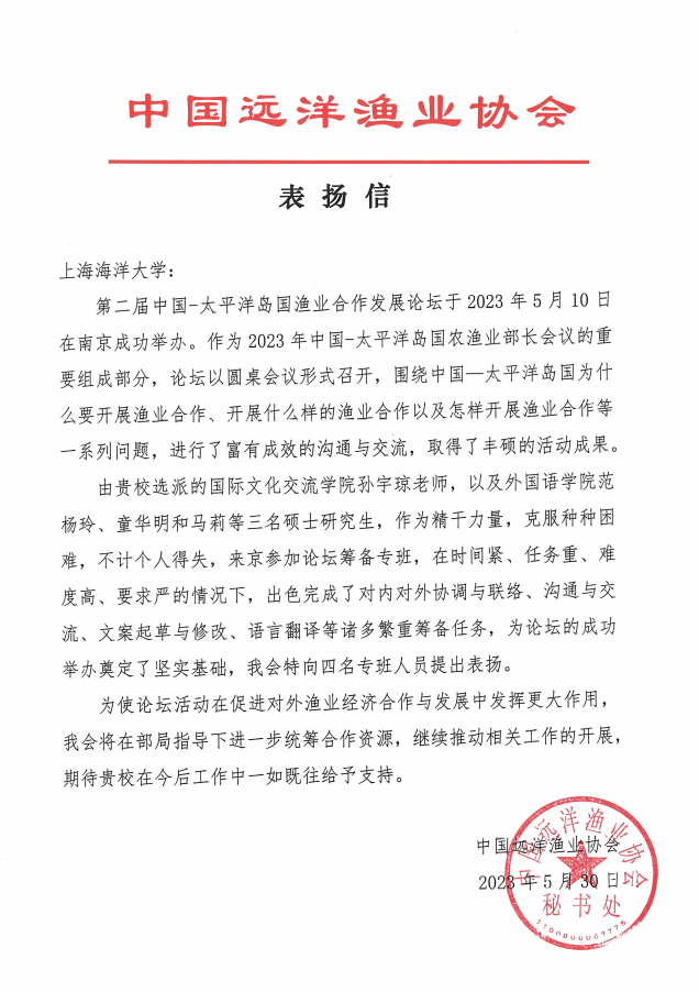 近日,中国远洋渔业协会致信学校,对国际文化交流学院及外国语学院参与2023年“第二届中国-太平洋岛国渔业合作发展论坛”前期准备工作的老师和三位研究生予以表扬,对学校的大力支持和积极参与表示感谢。