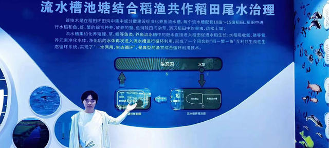 管卫兵教授团队研究生带领观众参观了黄河经济鱼类水产种质资源场、黄河渔文化馆和“稻渔空间”。团队长期扎根宁夏,大规模推广陆基生态渔场构建技术,服务西部脱贫攻坚和乡村振兴。通过改变传统耕作方式,整合资源生态学、多营养级水产养殖理论,优化稻田和养殖系统布局,实现大规模水产和农作物、畜禽的综合生态化利用,形成以陆基渔场为主体的立体复合农业生态系统,有效推动了宁夏地区一二三产业的融合发展,稻渔空间也被农业农村部评为中国美丽休闲乡村。