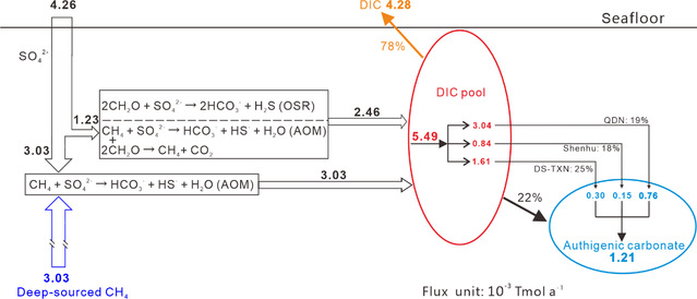 图 3. 南海北部海底碳和硫循环过程和自生碳酸盐形成效率。南海北部自生碳酸盐形成效率在22%左右。AOM:甲烷厌氧氧化作用;OSR:有机质硫酸盐还原;DIC:溶解无机碳。