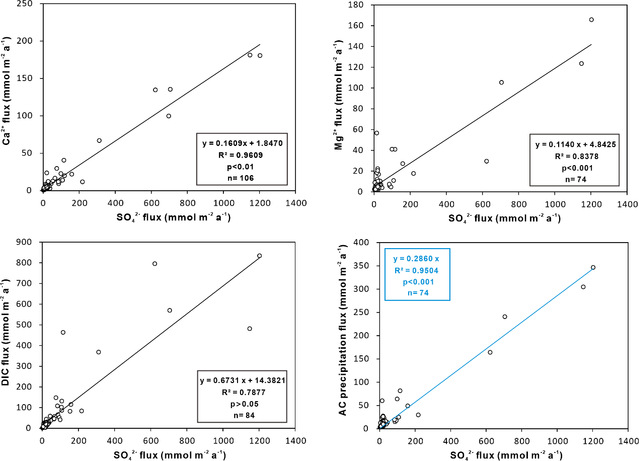 图 2. 相关扩散通量和硫酸盐(SO42-)扩散通量的关系图。AC代表形成的自生碳酸盐,其形成速率为钙(Ca2+)和镁离子(Mg2+)通量之和。DIC为溶解无机碳。