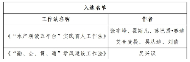 “水产耕读五平台”实践育人工作法积极探索新时代耕读教育新内涵、新模式,用大思政理念衔接农科专业和创新实践,以培养 “一懂两爱”的农业人才为目标,立足学校办学特色,积极融入丰富的国史国情、校史校情元素,突出“水产一流学科”特色,增强价值、政治、文化引领等多元教育功能。“融、会、贯、通”学风建设工作法基于成果导向教育理念,以大学生的职业生涯发展为主线,聚焦人才培养目标,努力营造有利于创新人才全面发展、茁壮成长的良好氛围和广阔空间,以“融、会、贯、通”四种方法,即“班团携领”融入教育、“学伴带领”知会教育、“志趣引领”贯行教育、“职业提领”通达教育为途径,打造大学生学风建设育人体系。