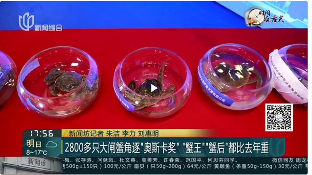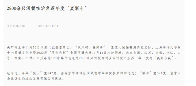 央广网以《2800余只河蟹在沪角逐年度“奥斯卡”》,报道了大赛盛况。