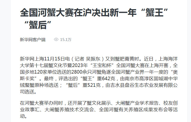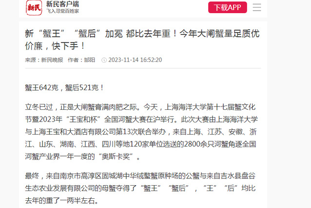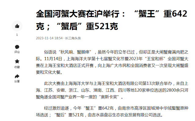 新华社则以《全国河蟹大赛在沪决出新一年“蟹王”“蟹后”》为题,简明扼要报道了河蟹大赛的情况。