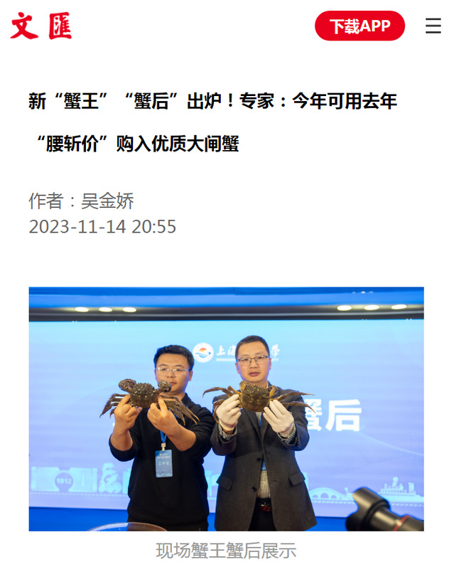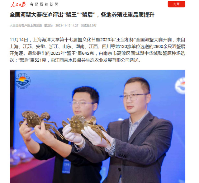 人民日报以《全国河蟹大赛在沪评出“蟹王”“蟹后”,各地养殖注重品质提升》为题,报道了蟹王、蟹后出炉以及全国河蟹养殖情况。