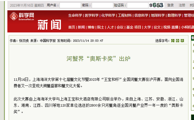 中国科学网报道“河蟹界“奥斯卡奖”出炉”,今日头条侧重蟹王、蟹后,“全国河蟹大赛在沪举行:‘蟹王’重642克;‘蟹后’重521克”。