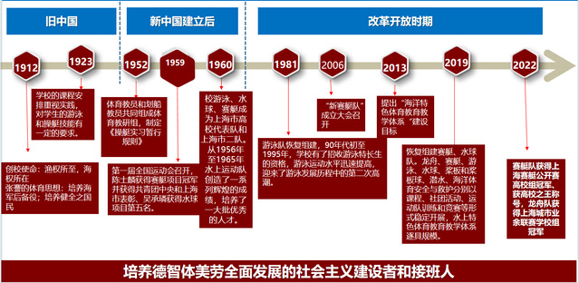 上海海洋大学前身是张謇、黄炎培创建于1912年的江苏省立水产学校,1952年升格为中国第一所本科水产高校——上海水产学院,1985年更名为上海水产大学,2008年更名为上海海洋大学。作为一所以海洋、水产、食品为学科特色的百年高校,学校创校之初就十分重视以赛艇、游泳为主要技能的水上运动项目。学校的特色水上运动伴随着学校学科专业建设发展不断丰富与提高,在20世纪五六十年代迎来一个辉煌时期。既有与学科专业紧密结合的航海多项运动、游泳运动,又有赛艇、水球等现代体育运动项目,形成了特色鲜明、形式多样的水上运动教学与训练体系。