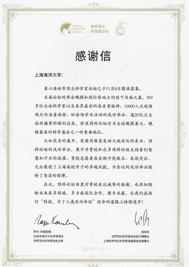学校收到第六届世界顶级科学家论坛协会的感谢信