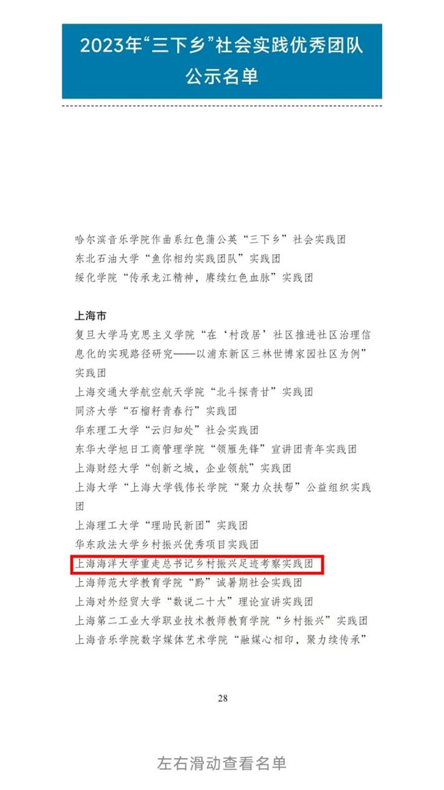 近日,团中央青年发展部公示通报了2023年全国大中专学生志愿者暑期文化科技卫生“三下乡”社会实践活动结果,经基层申报、省级团委审核推荐、组织评议等环节,上海海洋大学由李佳薇、管卫兵和方晨光三位老师指导的重走习近平总书记乡村振兴足迹考察实践团从来自全国各地实践团队中脱颖而出,荣获2023年“三下乡”社会实践优秀团队荣誉称号!全国共432个、上海共15个团队获此殊荣。
