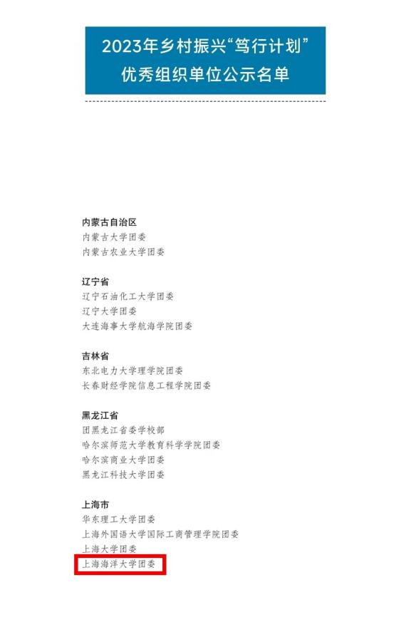 近日,团中央青年发展部发文公示2023年乡村振兴“笃行计划”专项行动拟表扬名单,经自主申报、择优推荐、组织评审等环节,上海海洋大学团委荣获2023年乡村振兴“笃行计划”优秀组织单位,全国共98个,上海仅4个单位获此荣誉!