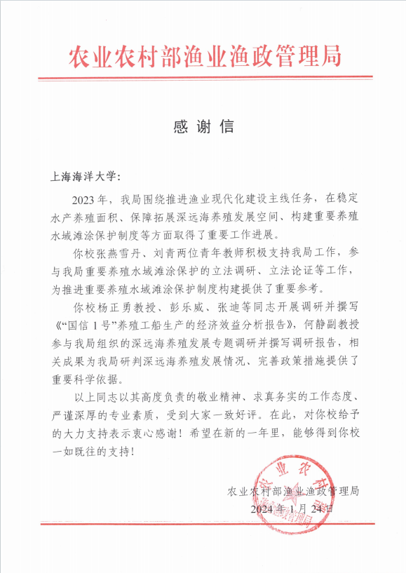 1月24日,农业农村部渔业渔政管理局专门致信我校,对上海海洋大学杨正勇、何静、彭乐威、张迪、张燕雪丹、刘青等6位同志在稳定水产养殖面积、保障拓展深远海养殖发展空间、构建重要养殖水域滩涂保护制度等方面取得的重要工作进展予以表扬,对学校长期以来的大力支持表示感谢。