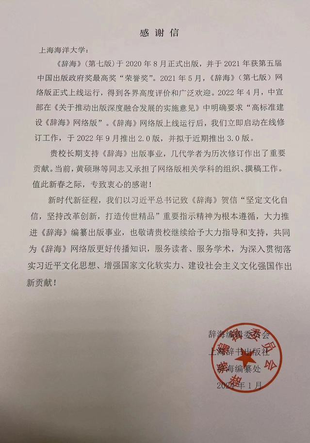 近日,《辞海》编辑委员会专门致信我校,对上海海洋大学黄硕琳、白志毅、胡庆松、华雪铭、黄林彬、季高华、李小勤、王锡昌、许柳雄、杨正勇、赵金良、钟俊生等13位同志在《辞海》(第七版)编纂过程中作出的突出贡献表示感谢,对学校长期以来为辞书出版给予的全面指导和大力支持表示感谢。