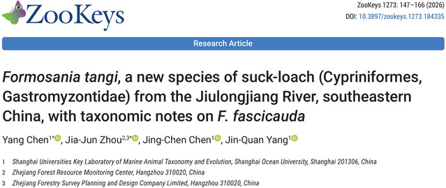 上海海洋大学与浙江省森林资源监测中心等单位近日联合在国际学术期刊《ZooKeys》发表研究成果,正式将福建九龙江流域发现的腹吸鳅科鱼类确立为新物种——文乔缨口鳅(Formosania tangi sp. nov.)。该物种发现于福建省九龙江流域,其命名旨在致敬上海海洋大学唐文乔教授在鱼类学领域的贡献,体现了学术精神的代际传承。论文链接:https://doi.org/10.3897/zookeys.1273.184335。